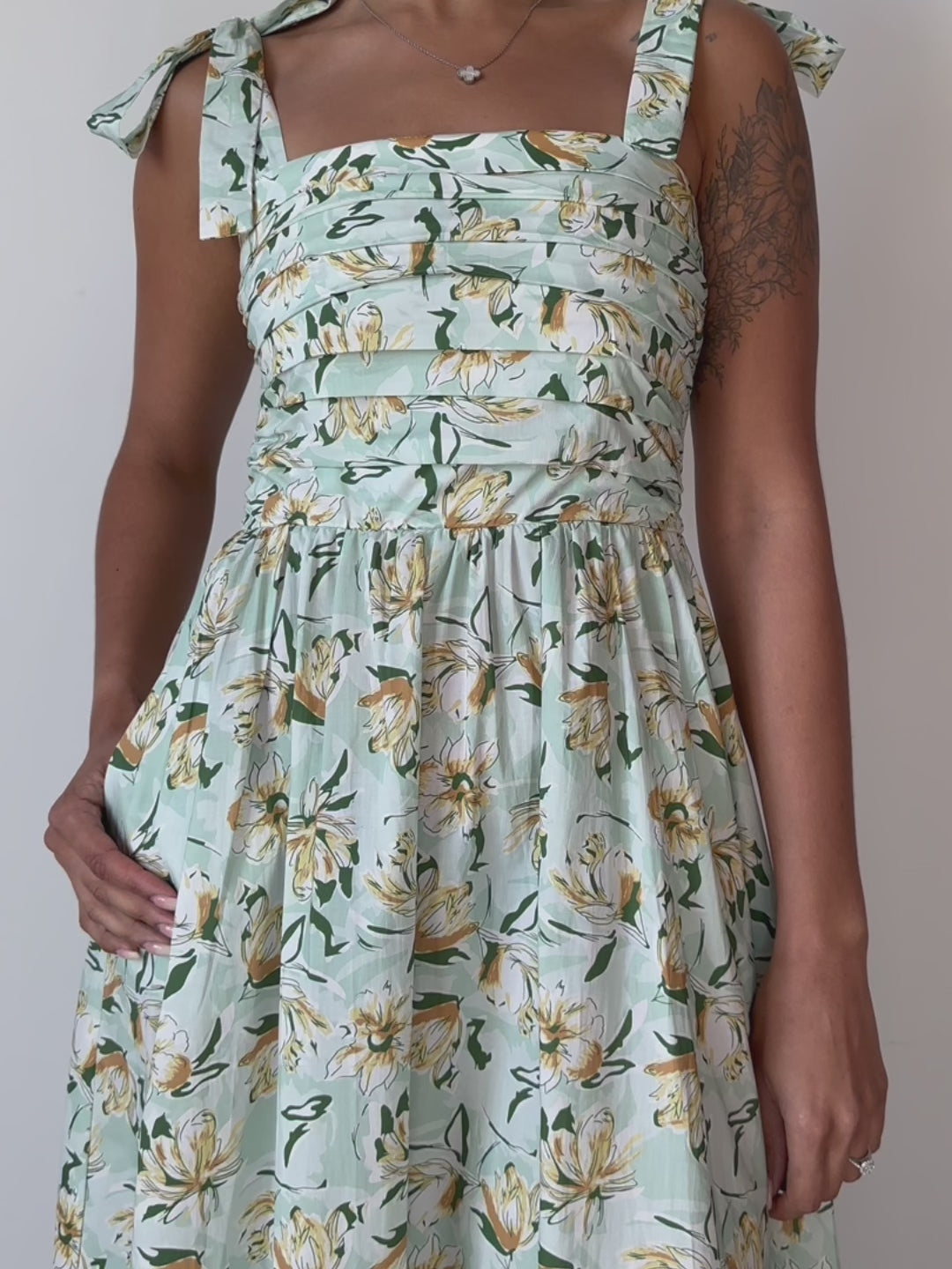 Deloris Maxi Dress - Green Floral Print is elegant yet practical, wear yours with strappy stilettos to complete the look. This Lakeyo piece is designed with a front bodice pintuck to add some layerings to the dress, best still it comes with side pockets.