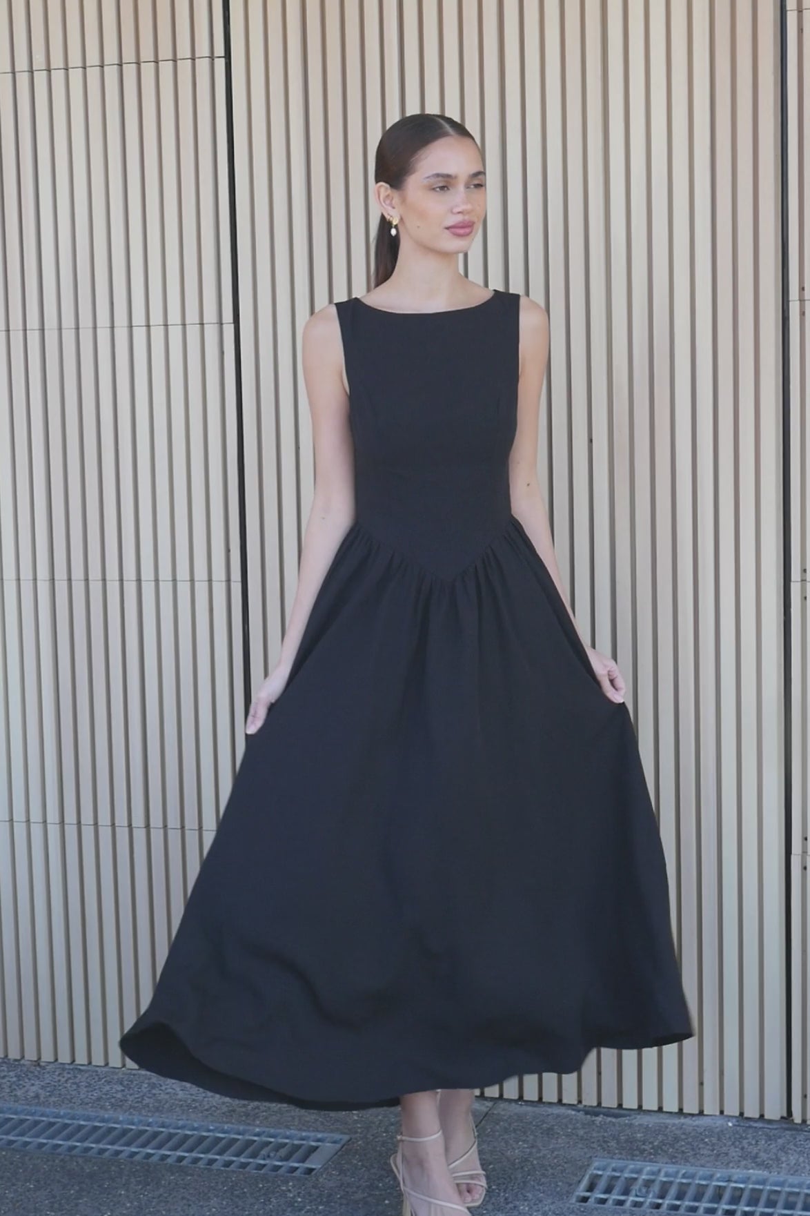 This timeless Kinsela Dress embodies sophistication and grace, perfect for a variety of occasions. With a sleek, sleeveless design, it offers a flattering silhouette that gently cinches at the waist before flowing into a graceful midi-length skirt. Its minimalist elegance is complemented by a slightly asymmetric hemline, adding a touch of modern flair.